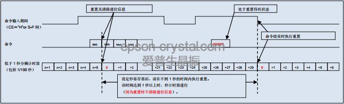 RESET位設(shè)定為”1”后,計(jì)時(shí)電路的低于1秒的計(jì)時(shí)器將在命令結(jié)束時(shí)被重置。欲在特定時(shí)間開(kāi)始準(zhǔn)確計(jì)時(shí)時(shí),可在設(shè)定時(shí)間后進(jìn)行重置,之后將每秒更新秒位計(jì)時(shí)器。