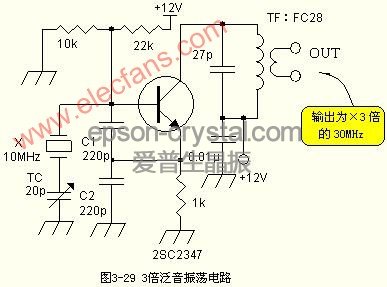 (此為利用無調(diào)整電路的高諧波成分,在輸出的諧振電路取出3倍頻的30MHz信號。)