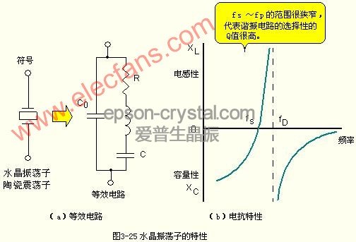 圖(a)所示的為其等效電路,圖(b)所示的為其電抗(Reaetance)特性。fs為串聯(lián)諧振頻率點fp為并聯(lián)諧振頻率點,其諧振頻率分別如下: