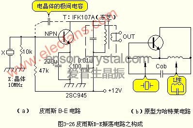 圖26的電路稱為皮爾斯B-E電路。其原型為圖(b)的哈特萊振蕩電路。哈特萊振蕩電路的電容器為利用晶體管的集極-基極間電容量Cab。
